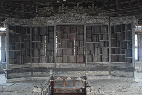 插屏宝座为紫檀木围子板;玻璃画镶玉,围子双面有雕刻,中间为透明玻璃。此宝座前束腰缺失,破损严重,雕饰件外围基本不存在,正面围子嵌玉大部分缺失,后背板用胶条粘接,面边璜撕裂,肩膀榫卯开裂脱落,大面积已经变形,腿牙处描金严重缺失。