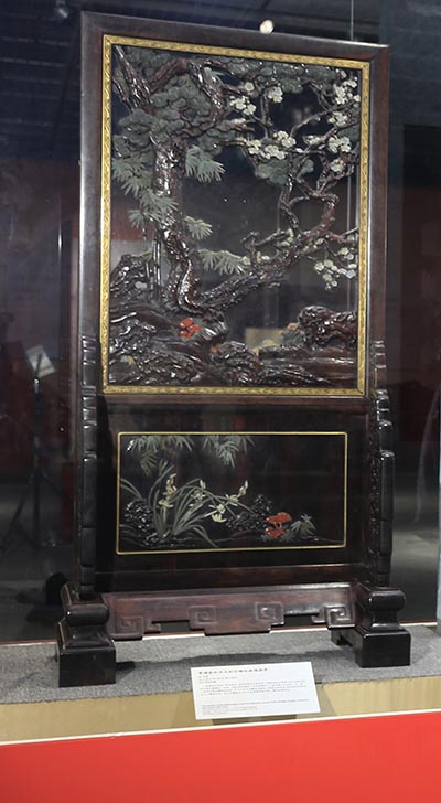 紫檀大插屏为紫檀木配青玉、珍珠贝雕松竹梅岁寒三友图,造型古朴,但雕刻华丽。远观给人以清新透彻之感。木质框架大部分存留完整,宝玉石及贝壳严重缺失,玉石松针、竹叶部分亦大量缺失。
