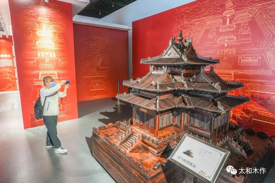 上图为按1:10制作的红酸枝紫禁城角楼模型,紫禁城角楼是四面凸字形平面组合的多角建筑,屋顶有三层,上层是纵横搭交的歇山顶,由两坡流水的悬山顶与四面坡的庞殿组合而成,因这种屋顶有九条主要屋眷,所以称作九眷殿。中层采用“勾连搭”的做法,用四面抱厦的歇山顶环拱中心的屋顶,犹如众星拱月。下层檐为一环半坡顶的腰檐,使上两层的5个屋顶形成一个复合式的整体。由干角楼的各部分比例谐调,檐角秀丽,造型玲珑别致,成为紫禁城的标志。